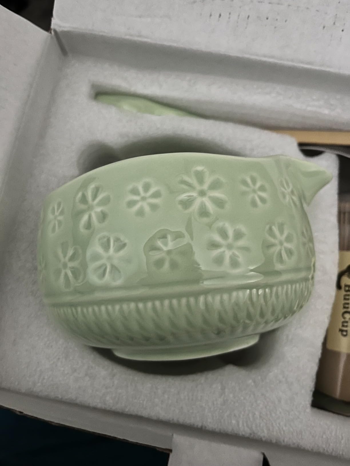 The embossed floral pattern and soft green glaze give this chawan a natural, earthy feel. Handmade with care, it brings a sense of calm and grounding to your matcha routine.